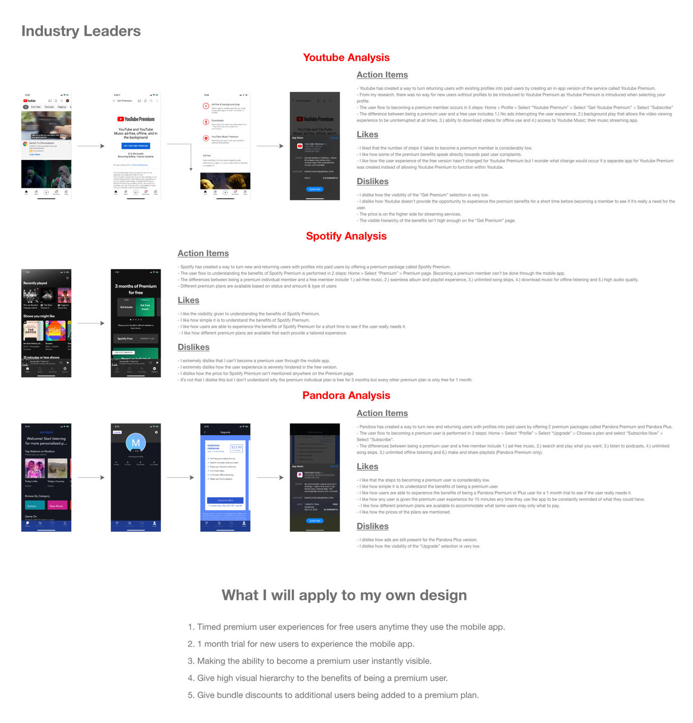 Goal: To begin, I needed to write exploratory questions that would help me find out why freemium users weren’t upgrading. From there, I could uncover what users valued most and what prevented them from moving forward.Methods Used:Desk Research- I reviewed industry reports and media studies to identify proven conversion strategies.- Desk research helped form exploratory questions by revealing patterns, best practices and gaps in current conversion models.Competitive Analysis- I studied YouTube, Spotify and Pandora to see what actions they took to present upgrade value, identify opportunities and find gaps in their current model.- This revealed how leading platforms framed benefits and limited free features to drive conversions.User Surveys- I gathered feedback on content preferences, price tolerance and upgrade motivations.- This ensured decisions were grounded in user data, not assumptions and reflected real attitudes toward paying.