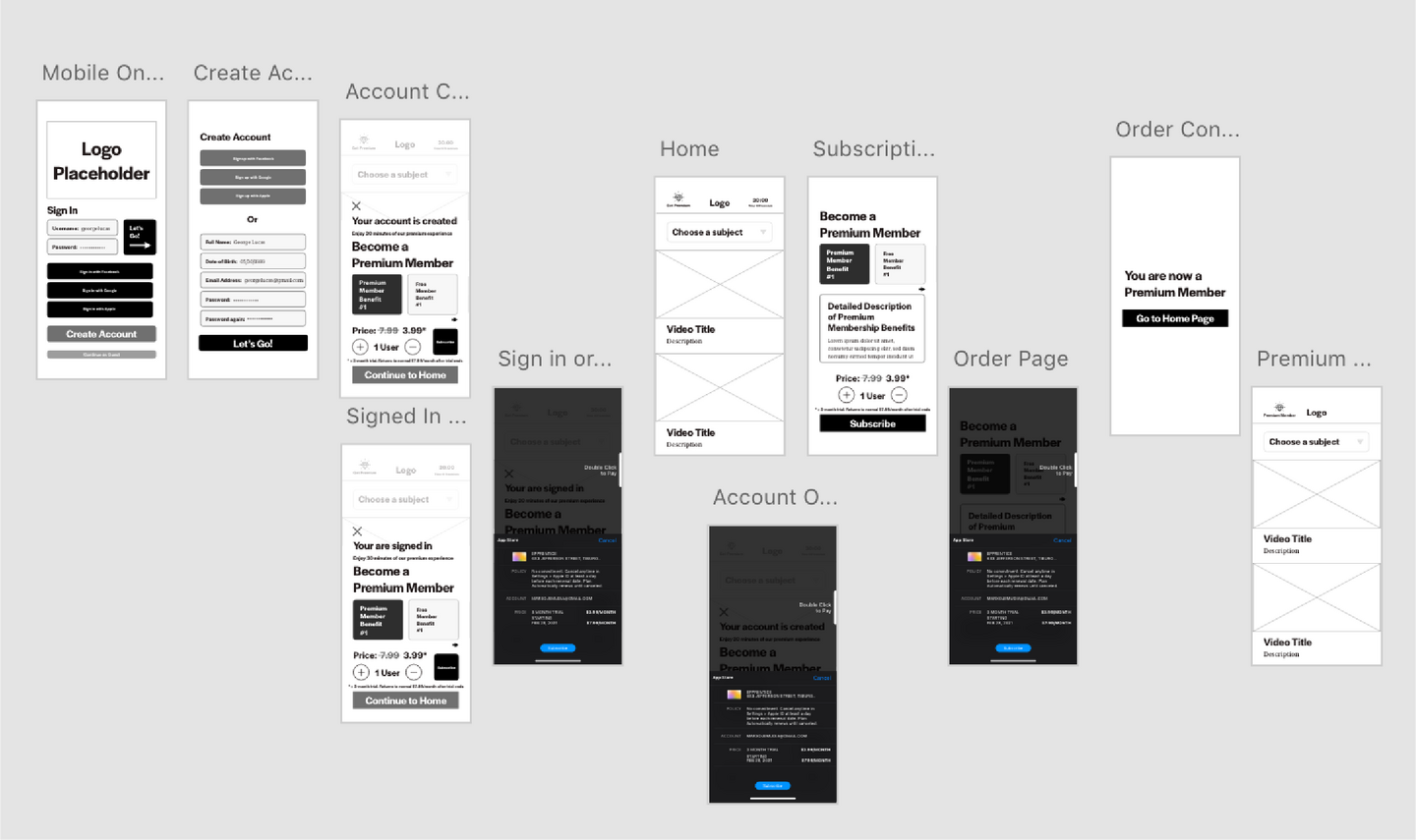 Goal: The goal was to design and test solutions within the subscription pipeline that made upgrading feel effortless and intuitive. This stage focused on turning the pipeline into a streamlined experience where users could recognize value early and move smoothly from free to premium.Methods Used:Brainstorming- I led a brainstorming session to generate solutions as answers to the HMW questions.User Flows- I designed user flows by integrating brainstormed solutions into a streamlined path that delivered information quickly and highlighted premium options early without disrupting the experience.- Through a user flow, I reduced the upgrade process to as few as three steps which created value for both users through simplicity and speed.Wireframing, Testing & Iteration- I translated the streamlined user flow and generated solutions into low-fidelity wireframes to visualize how upgrade prompts, incentives, and content hierarchy would appear across the pipeline. Afterward, I conducted one-day usability testing with five users familiar with streaming services using the 5-step GV interview method.- These methods were used to validate design decisions quickly, identify usability barriers and observe how users reacted to upgrade prompts. Iterating after each session helped refine clarity, flow and placement, ensuring the design supported both smooth navigation and stronger subscription intent.