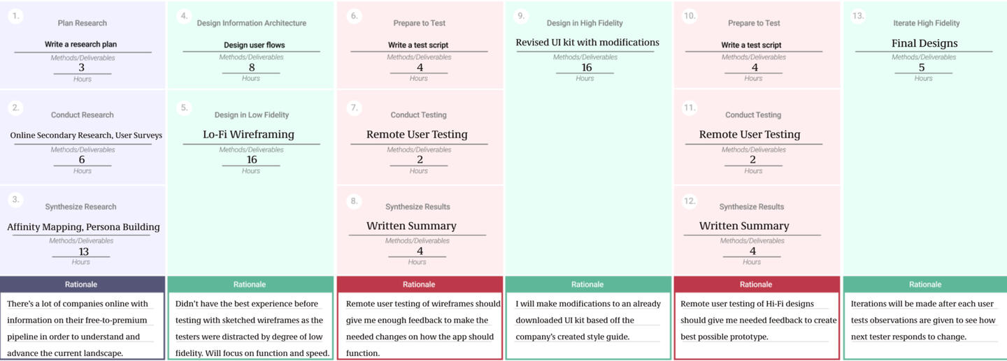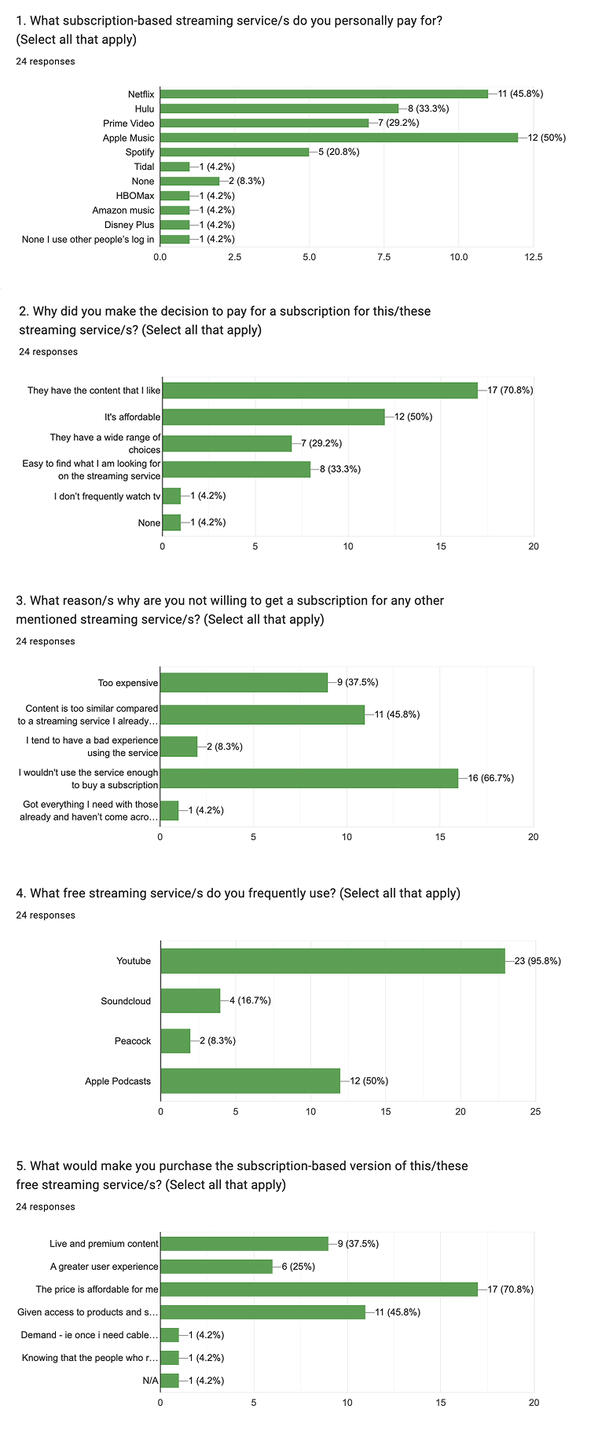 Goal: To begin, I needed to write exploratory questions that would help me find out why freemium users weren’t upgrading. From there, I could uncover what users valued most and what prevented them from moving forward.Methods Used:Desk Research- I reviewed industry reports and media studies to identify proven conversion strategies.- Desk research helped form exploratory questions by revealing patterns, best practices and gaps in current conversion models.Competitive Analysis- I studied YouTube, Spotify and Pandora to see what actions they took to present upgrade value, identify opportunities and find gaps in their current model.- This revealed how leading platforms framed benefits and limited free features to drive conversions.User Surveys- I gathered feedback on content preferences, price tolerance and upgrade motivations.- This ensured decisions were grounded in user data, not assumptions and reflected real attitudes toward paying.