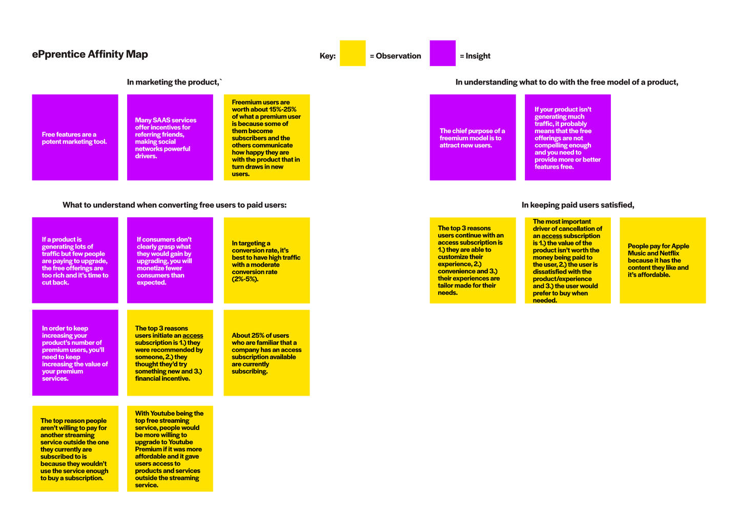 Goal: With a foundation of exploratory questions and supporting evidence established, the next goal was to organize and interpret the research data to identify what mattered most to users. The focus shifted to uncovering insights, defining problem scopes and shaping clear design direction that would inform how free users could be guided toward premium conversion.Methods Used:Affinity Mapping- I grouped research observations and user feedback such as behaviors, motivations and frustrations to uncover themes & insights.- Affinity mapping would expose unseen connections between free feature use, upgrade interest and long-term retention.User Personas- I created personas representing core user segments of the Epprentice platform with distinct subscription-related goals and motivations.- User personas clarified who the design served and ensured future solutions matched user needs and business goals.Problem Statement Generation- I synthesized insights from mapping and personas into clear problem statements focused on conversion pain points.- How Might We (HMW) questions turned complex data into actionable design targets by reframing user frustrations as opportunities for value creation.